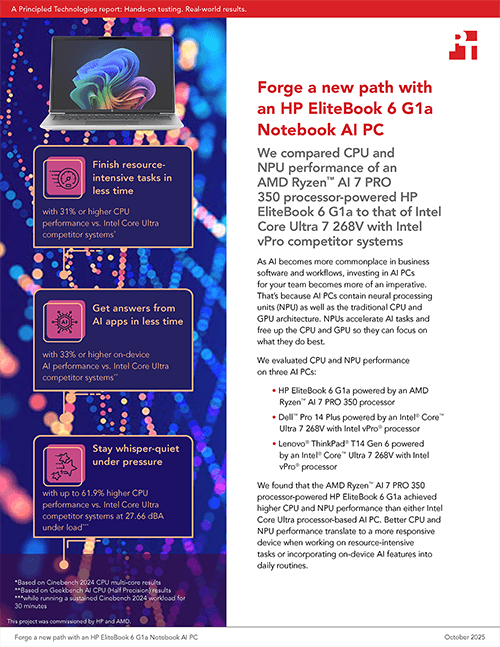 PT released a test report that covers their findings. PT found that “the AMD Ryzen AI 7 PRO 350 processor-powered HP EliteBook 6 G1a achieved higher CPU and NPU performance than either Intel Core Ultra processor-based AI PC.” They added: “Better CPU and NPU performance translate to a more responsive device when working on resource-intensive tasks or incorporating on-device AI features into daily routines.”